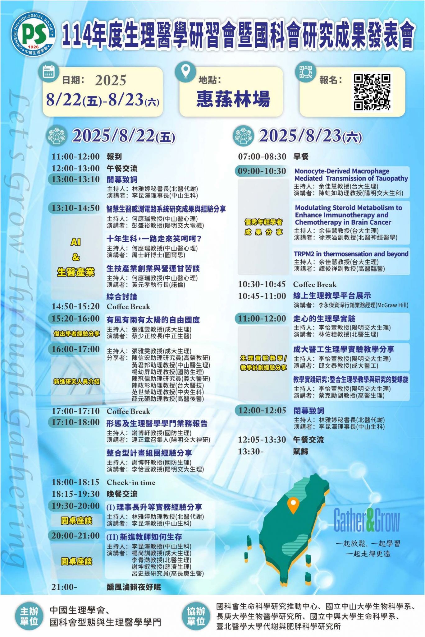 中國生理學會謹訂於2025年8月22日(五)至8月23日(六)假中興大學惠蓀林場(南投縣仁愛鄉)舉辦「114年度生理醫學研習會暨國科會研究成果發表會(2025 CPS Retreat)」,誠摯邀請各位會員踴躍報名參加!