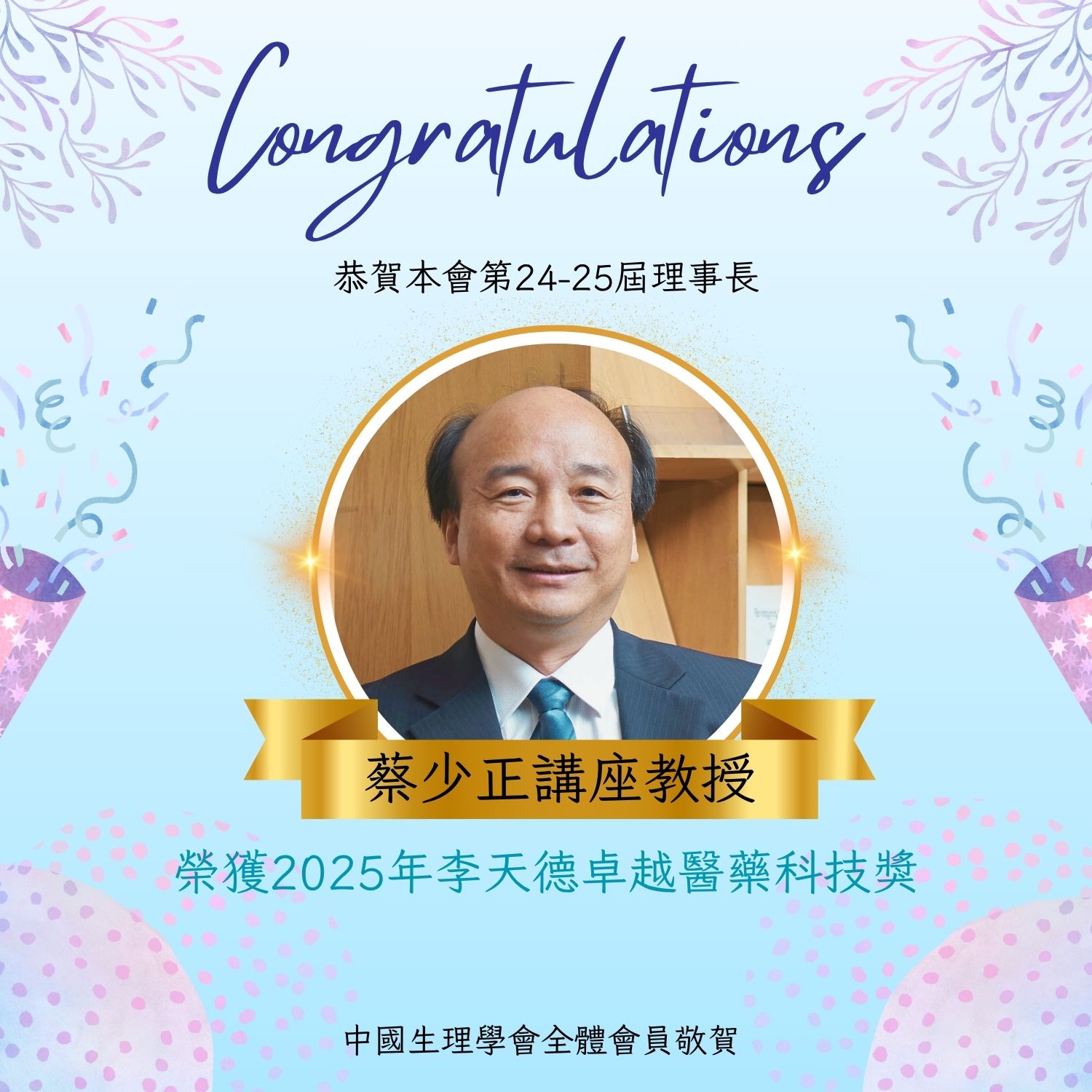 中國生理學會全體會員敬賀本會第24–25屆理事長、蔡少正講座教授,榮獲第21屆於2025年頒發之「李天德卓越醫藥科技獎」。