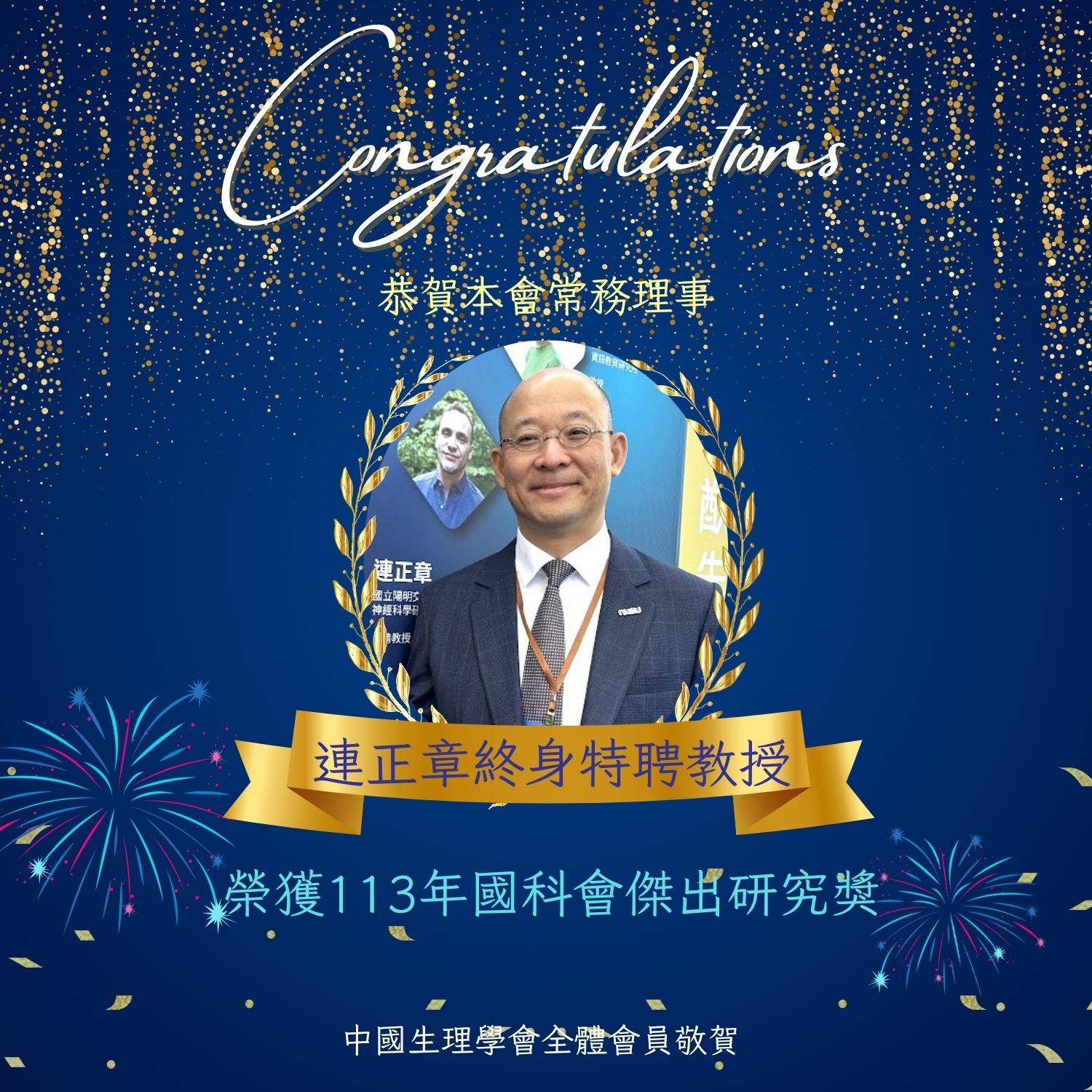 中國生理學會全體會員敬賀本會常務理事, 連正章終身特聘教授, 榮獲113年國科會傑出研究獎。