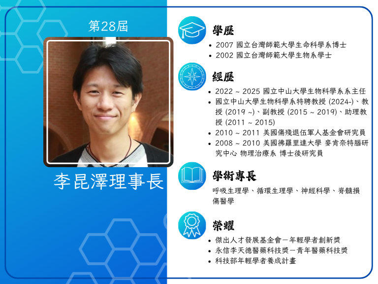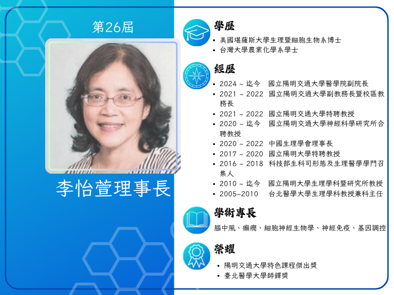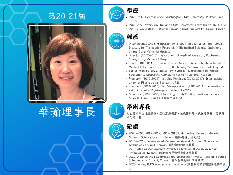 教育委員會(2025-2027); 余佳慧常務理事獲選為IUPS理事(2022-2025) 及FAOPS 理事(2019-2023),後進一步獲選擔任FAOPS treasurer職務 (2023-2027),持續為台灣生理學教育及研究在亞太地區及世界舞台發聲。