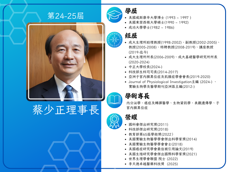 經歷在台復會後,台灣生理界已累積六十多年之教學與研究之學術成果。透過歷屆理事長與理監事之努力不懈,幫助中國生理學會持續轉型與成長,讓世界看到二十一世紀的台灣生理學教育及學術研究之璀璨未來。
